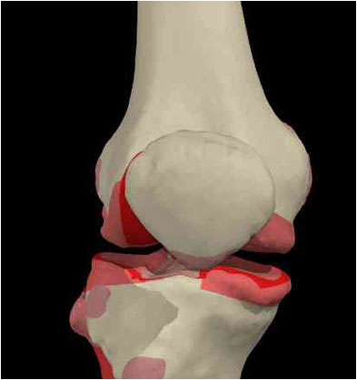 The end of the thighbone, the top of the shinbone, and the undersurface of the kneecap are covered with a thin layer of smooth cartilage (shaded pink/red here) that provides a frictionless and protective surface for joint motion.