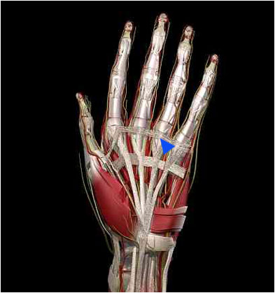 A "trigger finger" occurs when a flexor tendon becomes inflamed, resulting in a thickening in the tendon. The thickened tendon can then catch (trigger) as it passes into its sheath at the base of the finger (arrow). As the finger is then flexed and extended, a painful popping sensation is felt.