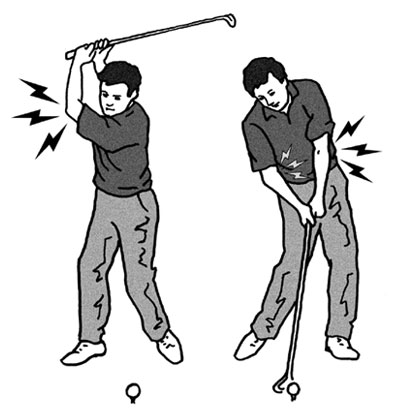 The elbow is susceptible to tendonitis injuries (tennis elbow and golfer’s elbow) at the transition from backswing to downswing (left image). Vigorous muscle contraction and tendon stretching from excessive wrist motion can lead to elbow tendonitis. At impact (right image), the forearm/elbow tendons are also under added stress as they absorb the force of the impact with the ball. An even greater jolt is absorbed by the elbows if the club strikes the ground or an object.
